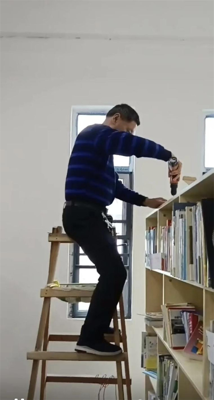 为了方便学生阅读,工作人员正在固定图书馆书柜,以防倒塌。